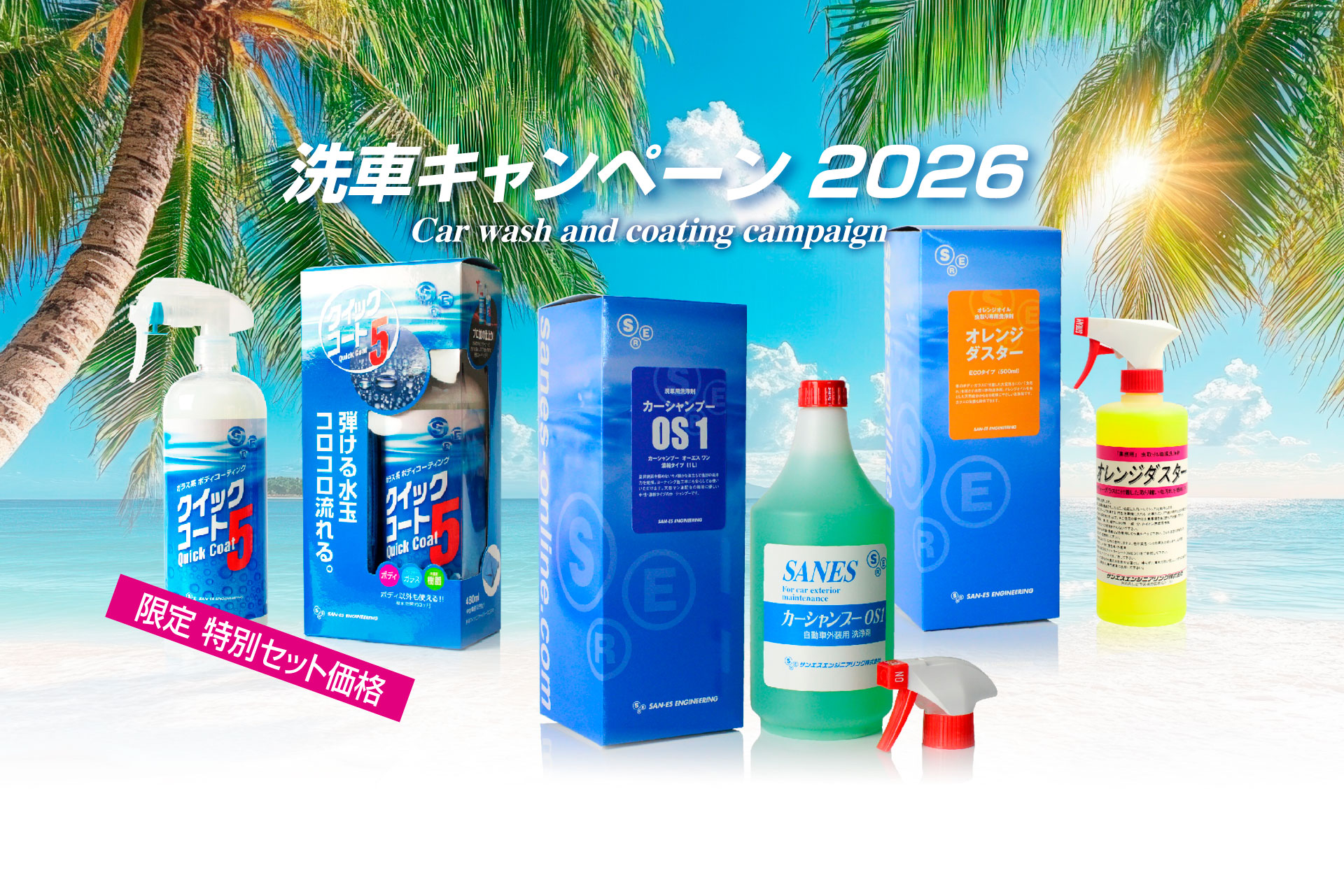 サンエスでは酷暑お見舞いといたしまて「夏の洗車キャンペーン2025」を開催! 行楽やレジャー後に最適な洗車アイテムを用意。きめ細かな泡立ちと泡切れの優れた「カーシャンプー OS1」、虫取り専用洗浄剤「オレンジダスター」、簡単撥水コーティング剤「クイックコート5」が、夏の爽やかな洗車体験を叶えます。お出かけも多くなるこの夏。この洗車セットを通常特価から、さらに大特価にて限定販売いたします。今だけの特別価格です。ぜひこの機会にお試しください。